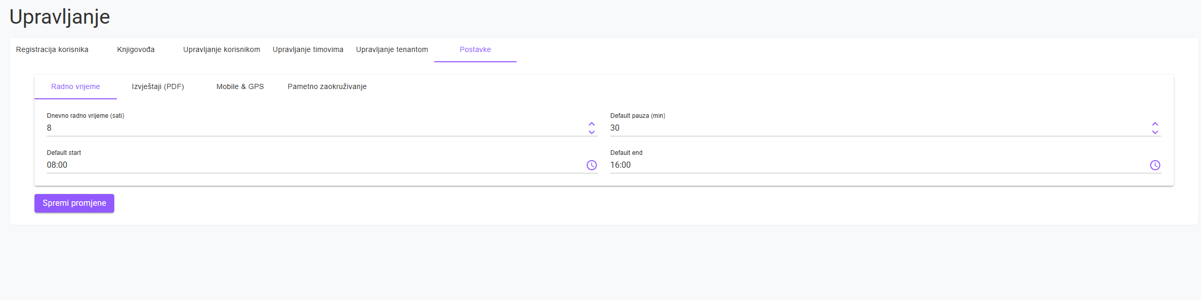 Konfigurirajte opće postavke vaše tvrtke – radno vrijeme, početak tjedna, formate datuma i ostale parametre koji se primjenjuju na sve zaposlenike.