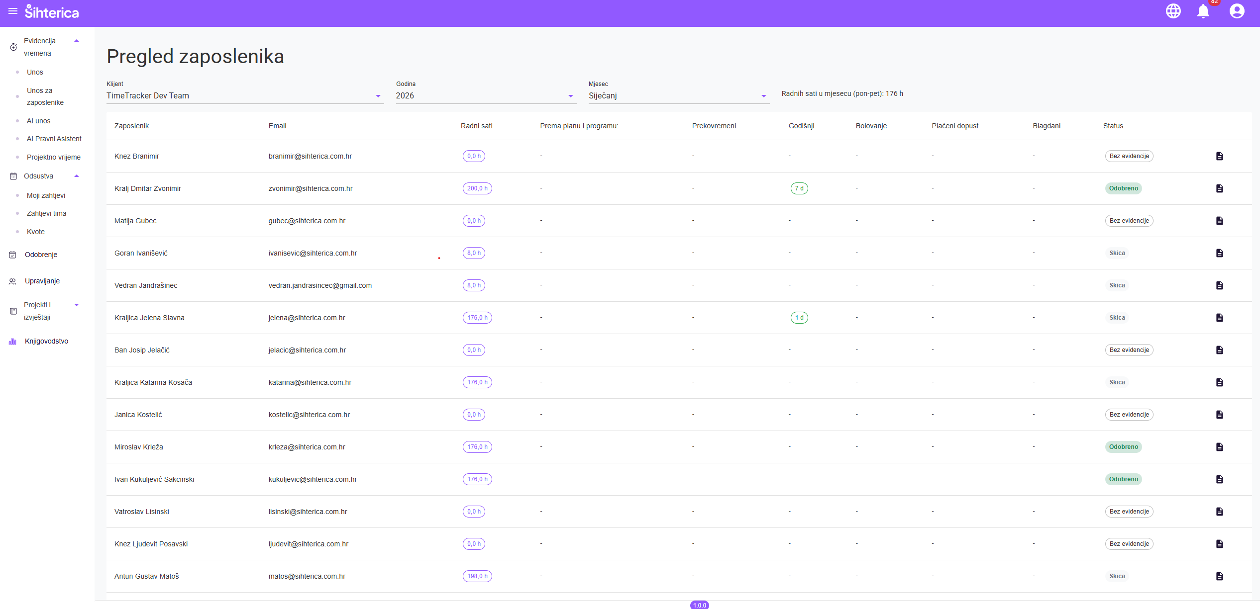 Sve prijave godišnjih odmora, bolovanja i drugih izostanaka na jednom mjestu. Pregledajte detalje, provjerite dostupnost tima i odobrite ili odbijte zahtjev s obrazloženjem.